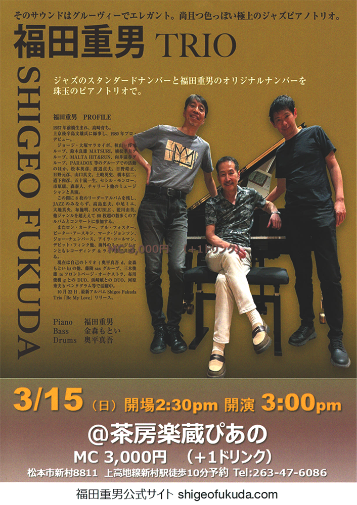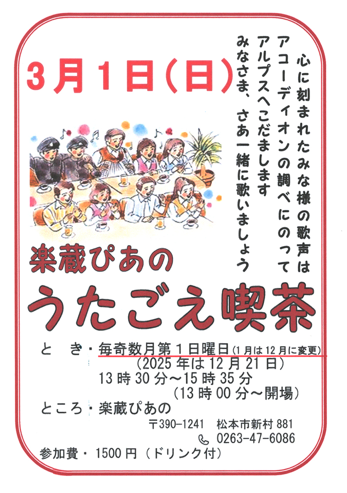 ご予約・お問い合わせは楽蔵ぴあのまで。TEL:0263-47-6086